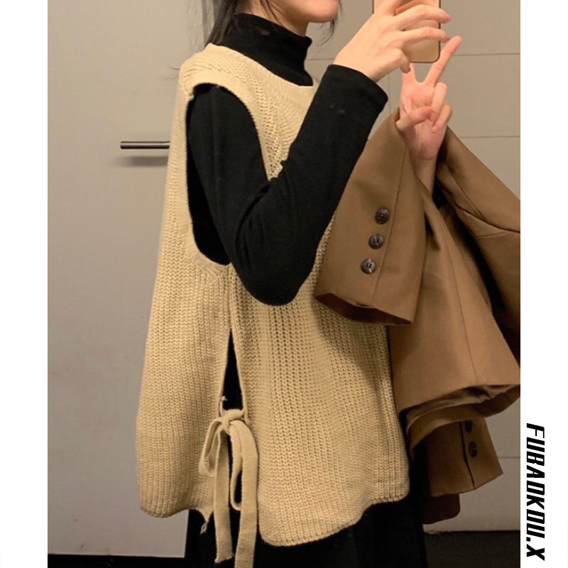 深めのVネックデザインで首元をすっきりと見せ、サイドのリボンディテールがアクセントになっています。