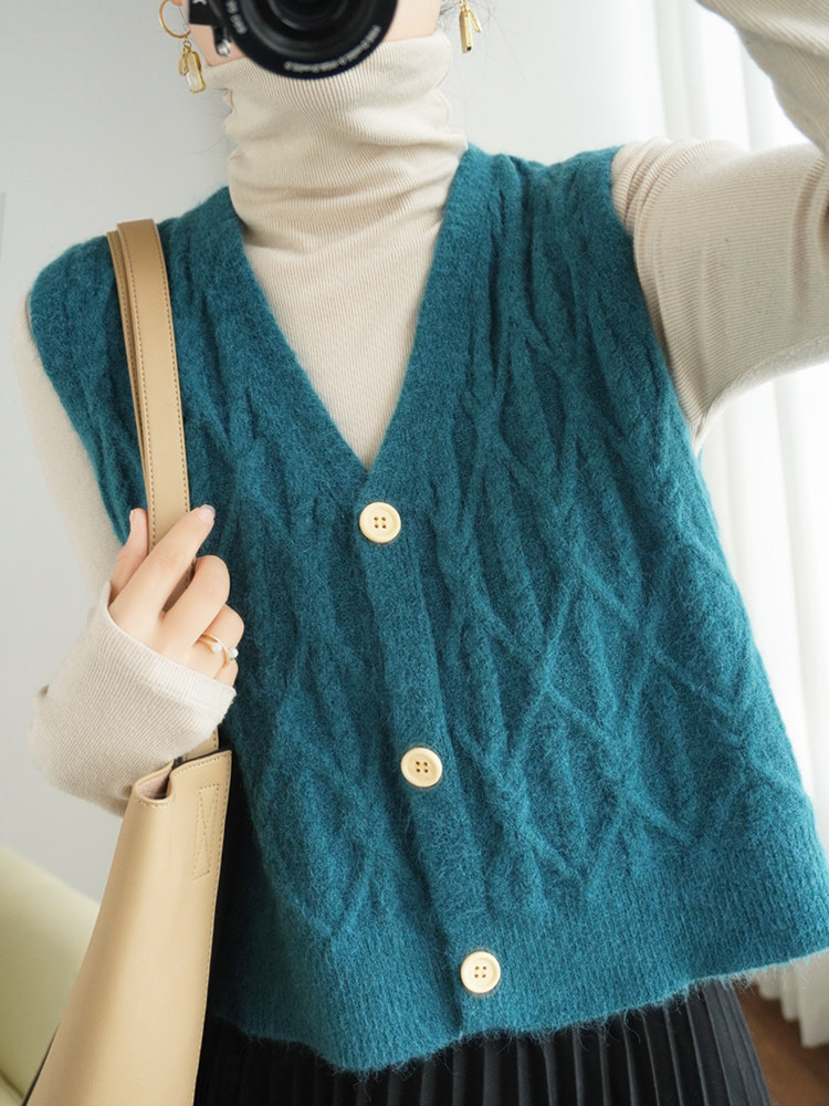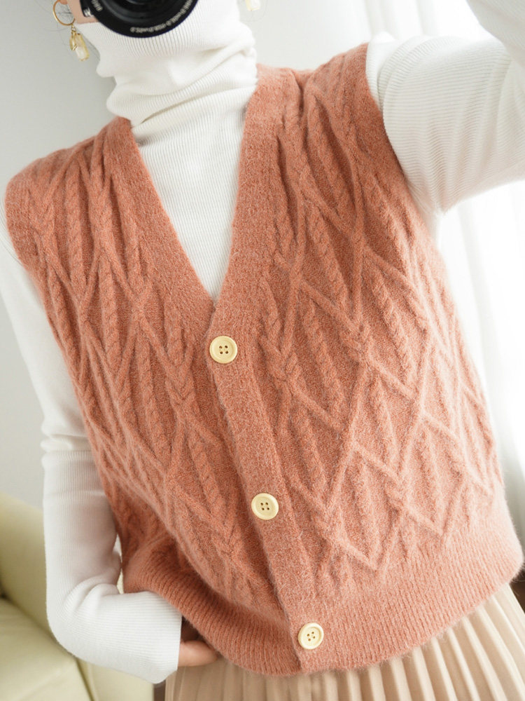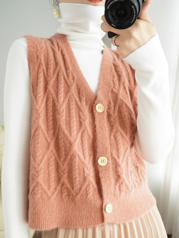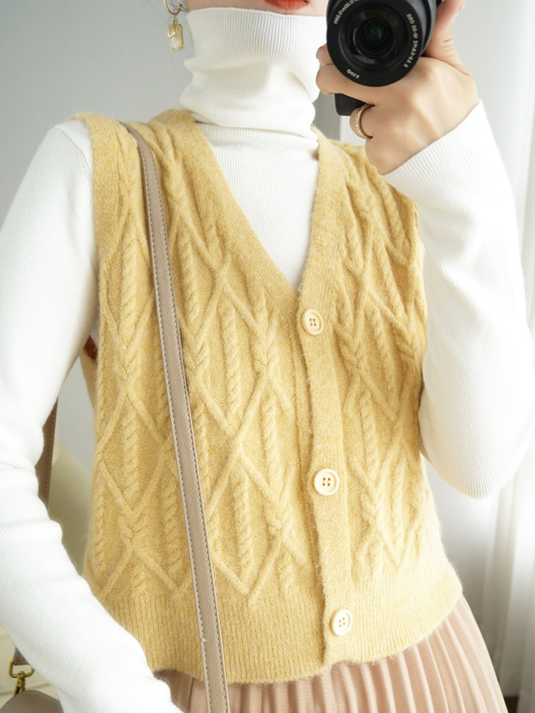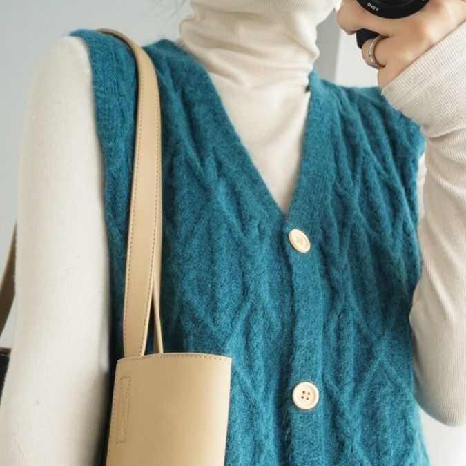 立体的なケーブル編みが印象的なビスチェは、秋冬のレイヤードスタイルに欠かせないアイテムです。