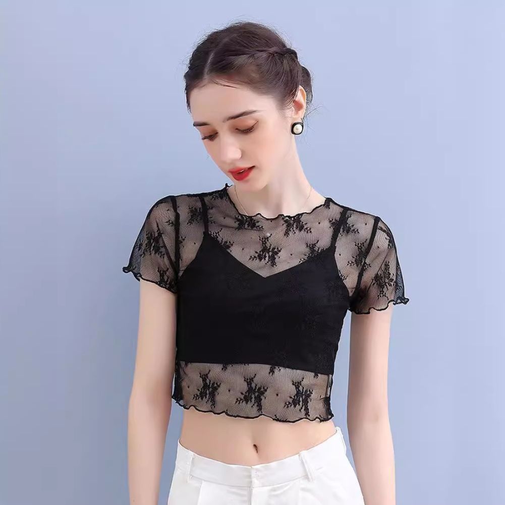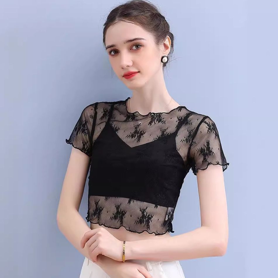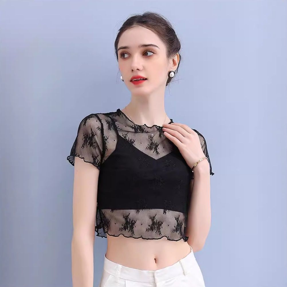 短めの半袖デザインで、シアー素材が上品な抜け感を演出します。
