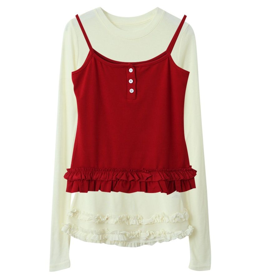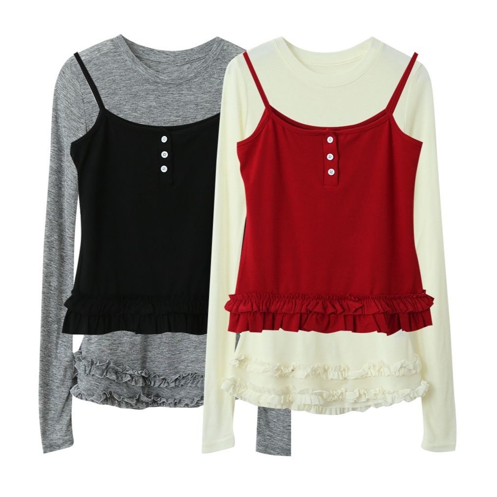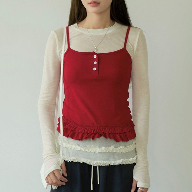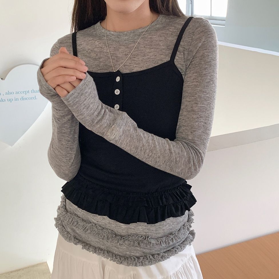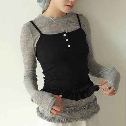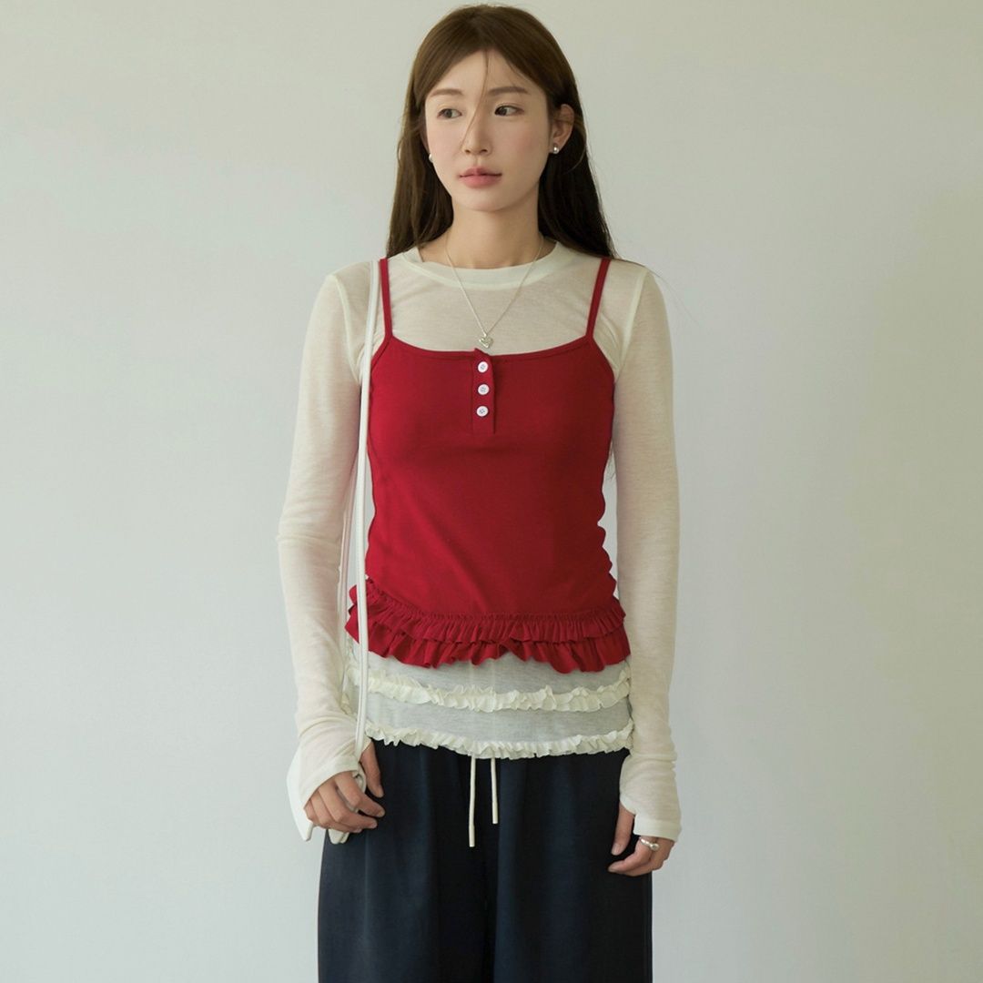 フロントの小さなボタンがアクセントになり、シアーな長袖インナーとの重ね着コーディネートで今季らしいスタイリングが完成します。