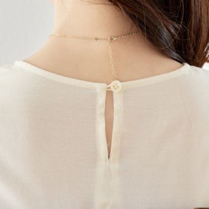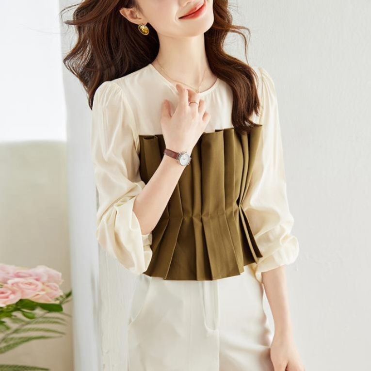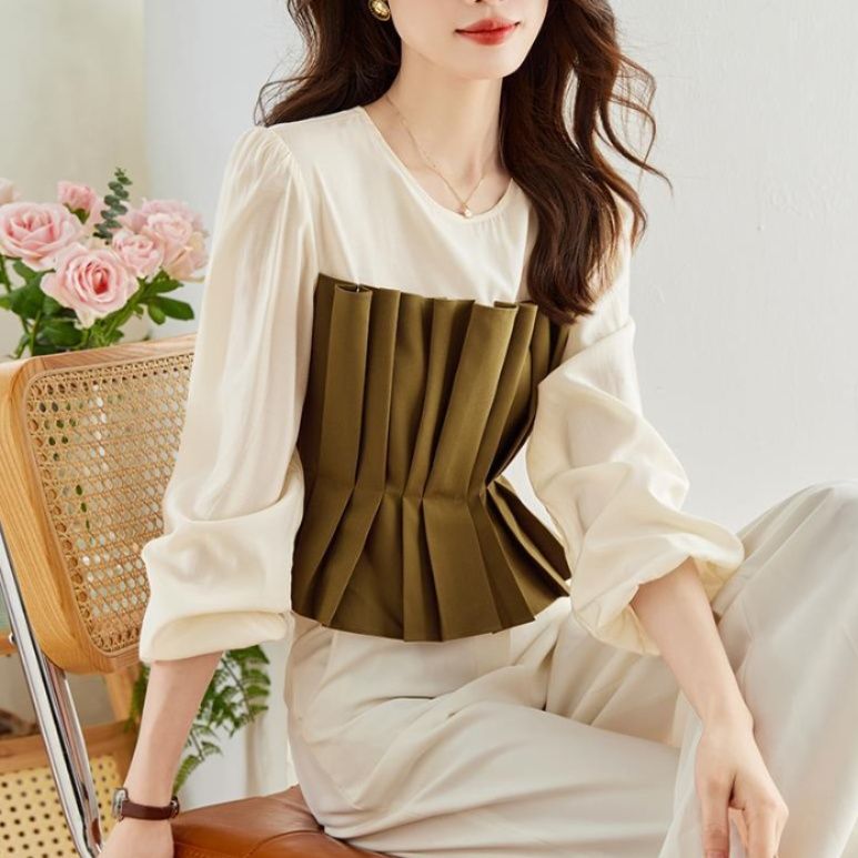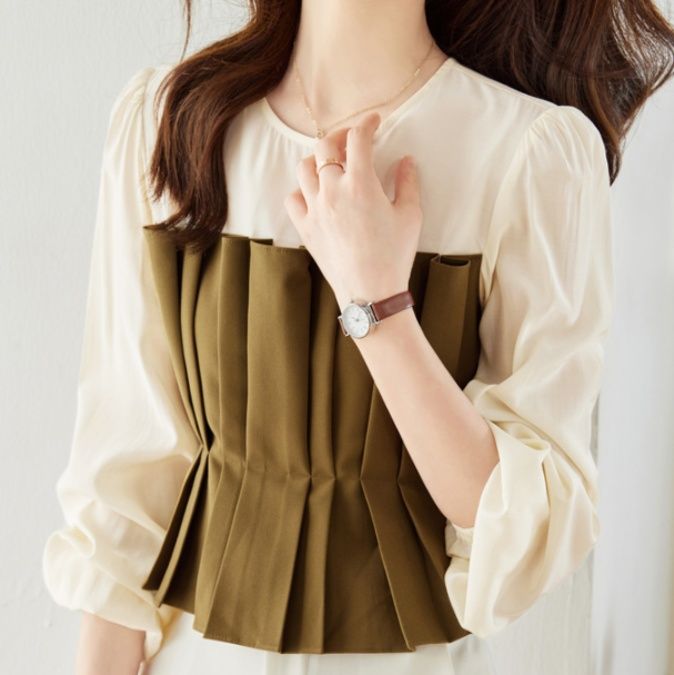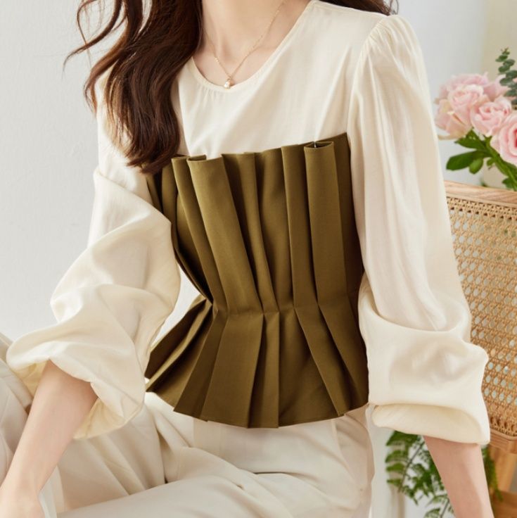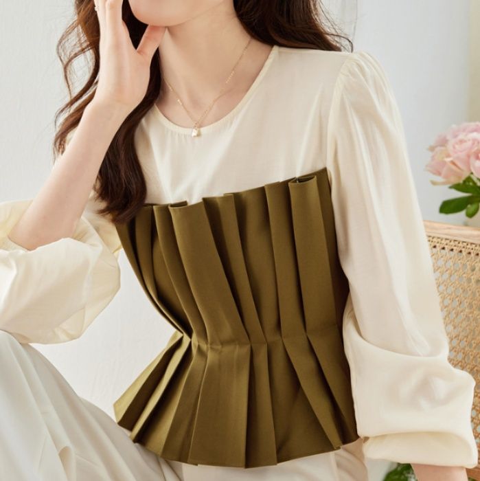 柔らかなブラウスに立体的なプリーツのコルセット風デザインを施した上品なトップスです。