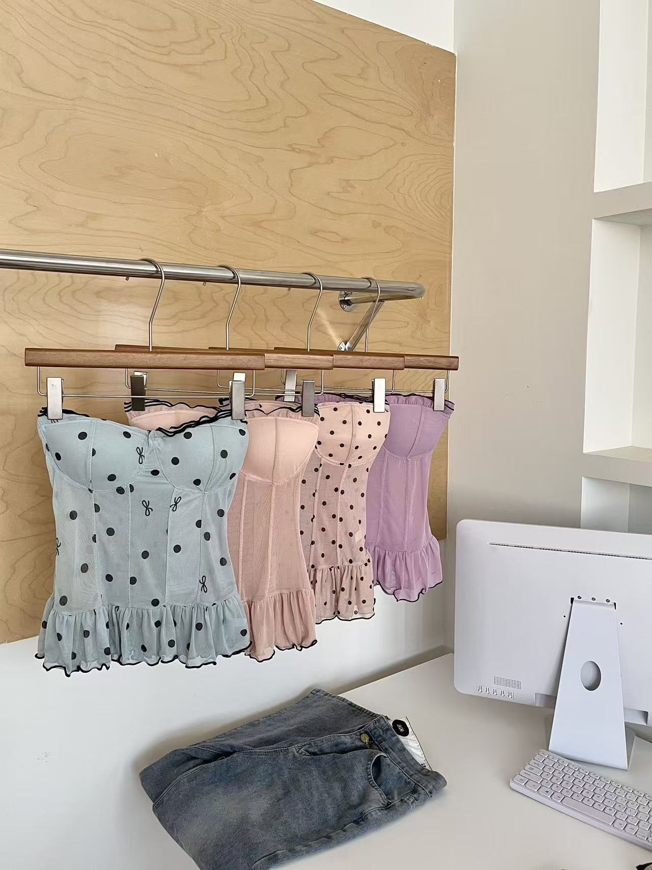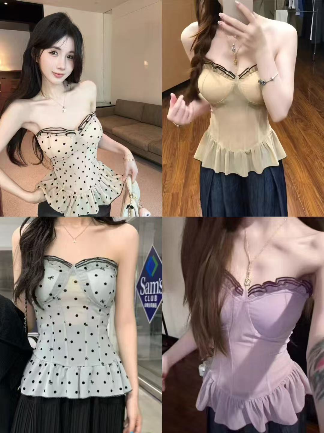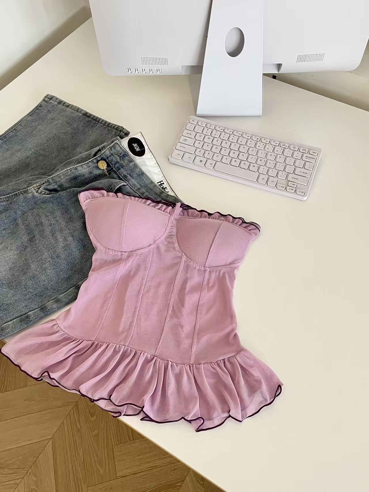 愛らしいドット柄が全面に散りばめられたビスチェです。 バストラインを美しく見せるカップ構造に、裾のフリルがフェミニンな印象を演出します。 パイピングのアクセントが全体を引き締め、大人可愛いスタイリングが完成します。 デニムやスカートと合わせて特別な日のコーディネートにぴったりです。 ウエストラインをすっきり見せる効果もあり、女性らしいシルエットを叶えます。