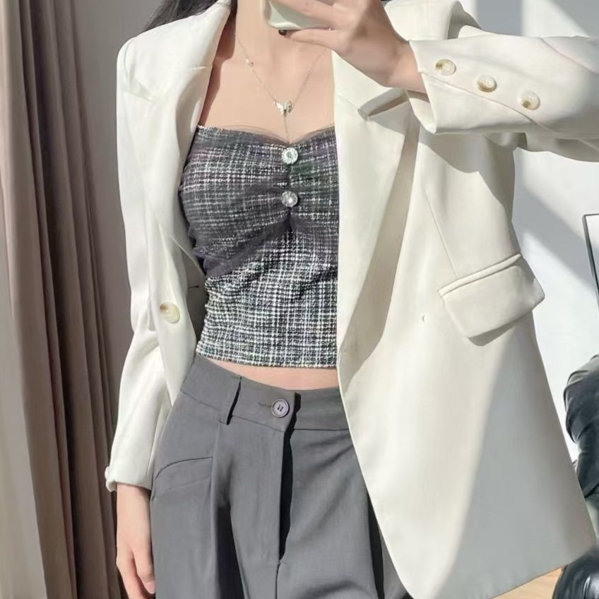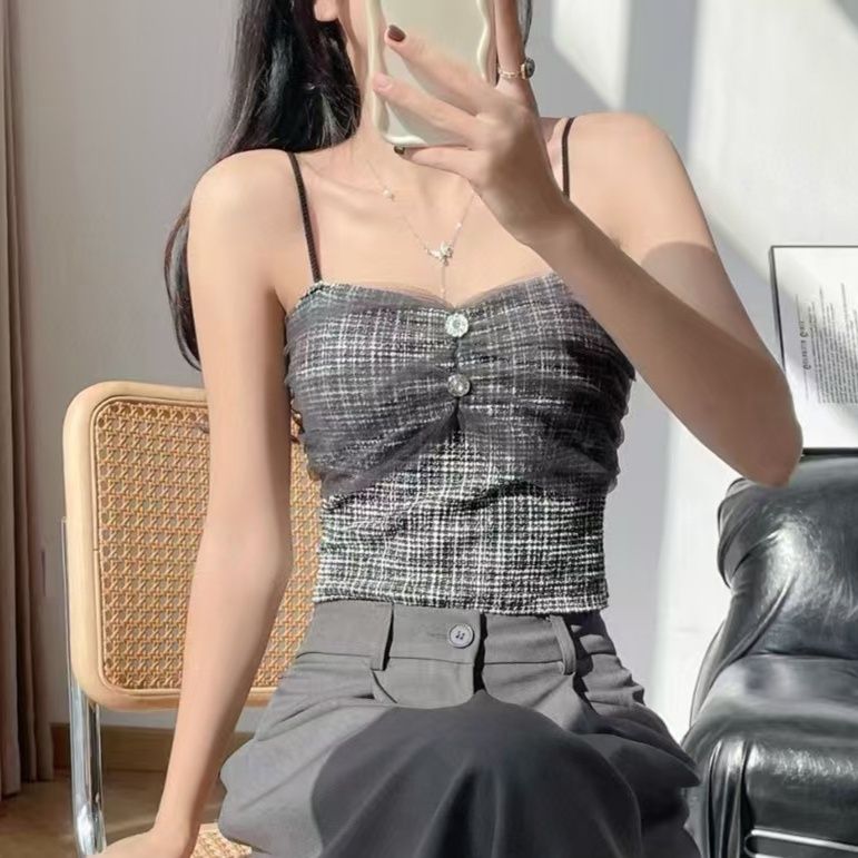 上品なツイード調素材が魅力的なビスチェです。 バストトップに配された宝石風のボタンがエレガントなアクセントになっています。 細い肩紐とハートネックラインが女性らしさを引き立て、体のラインを美しく見せてくれます。 ビスチェらしいコンパクトな丈感で、ハイウエストボトムスとの相性も抜群です。 デイリーからお出かけまで幅広く活躍する万能アイテムで、ビスチェコーディネートの主役になります。