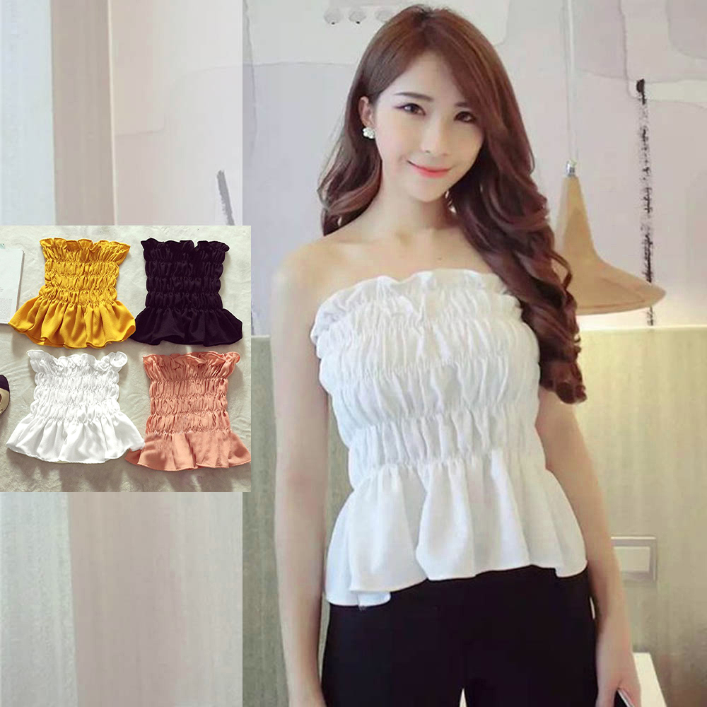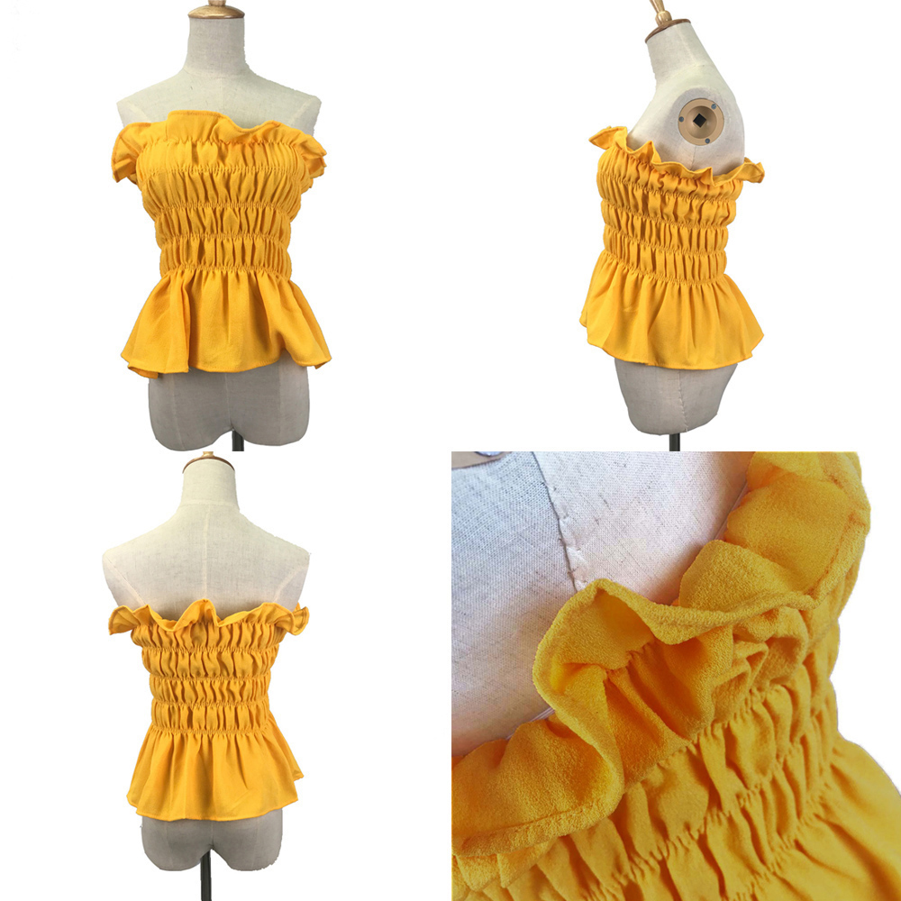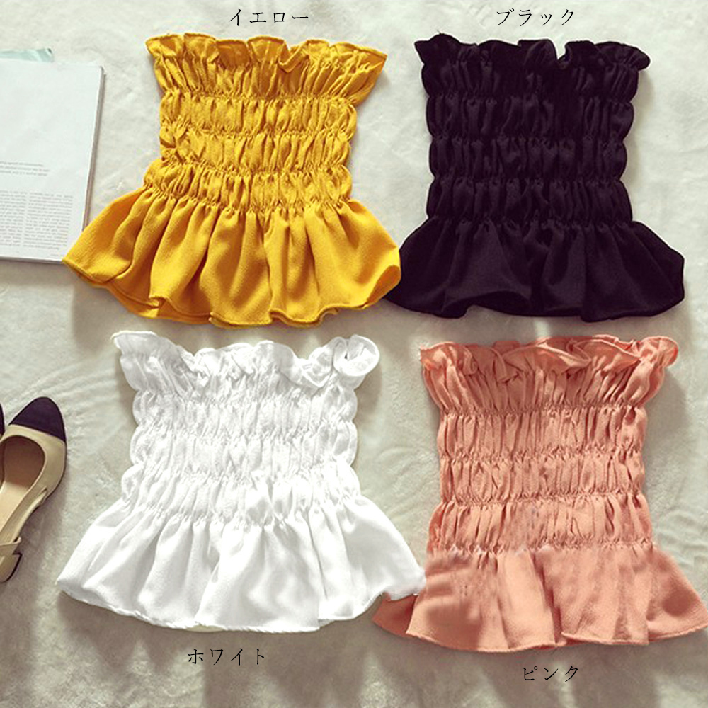 カラー:ブラック/ホワイト/イエロー/ピンク サイズ:ワンサイズ 着丈:約39cm バスト:約52-110cm 裏地:なし 伸縮性:あり 透け感:色によって若干あり 生地の厚さ:薄手 肌ざわり:さらっとしている