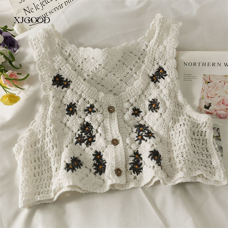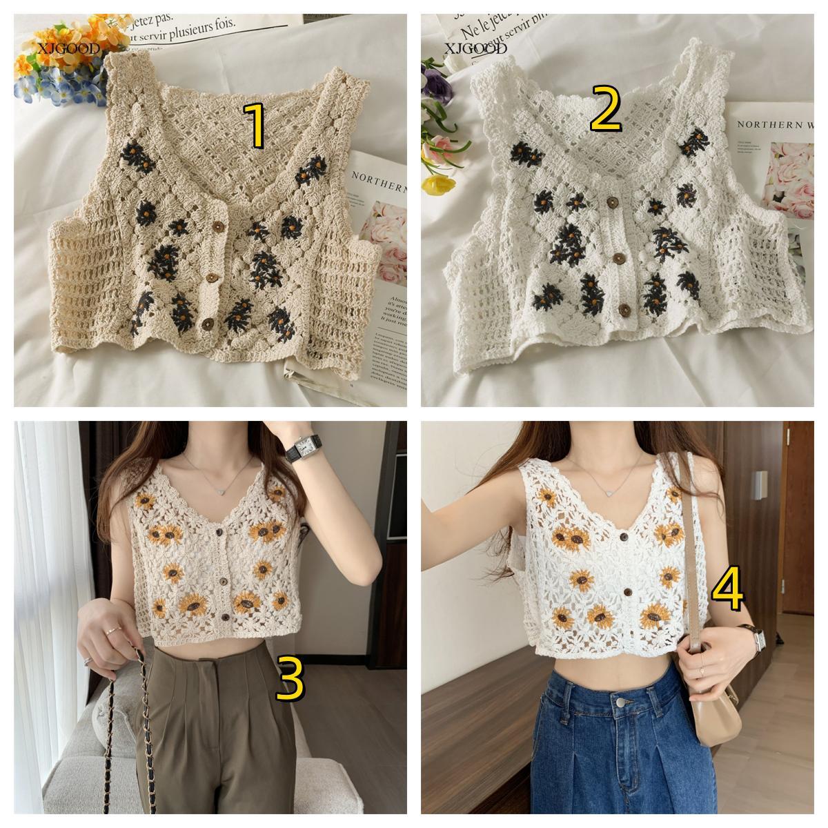 可愛らしい花柄モチーフが魅力的な手編み風ニットビスチェです。 透け感のある編み込みデザインで、重ね着にも単体着用にも最適。 ボタン開閉で着脱しやすく、日系ファッションにぴったりの上品な仕上がりです。