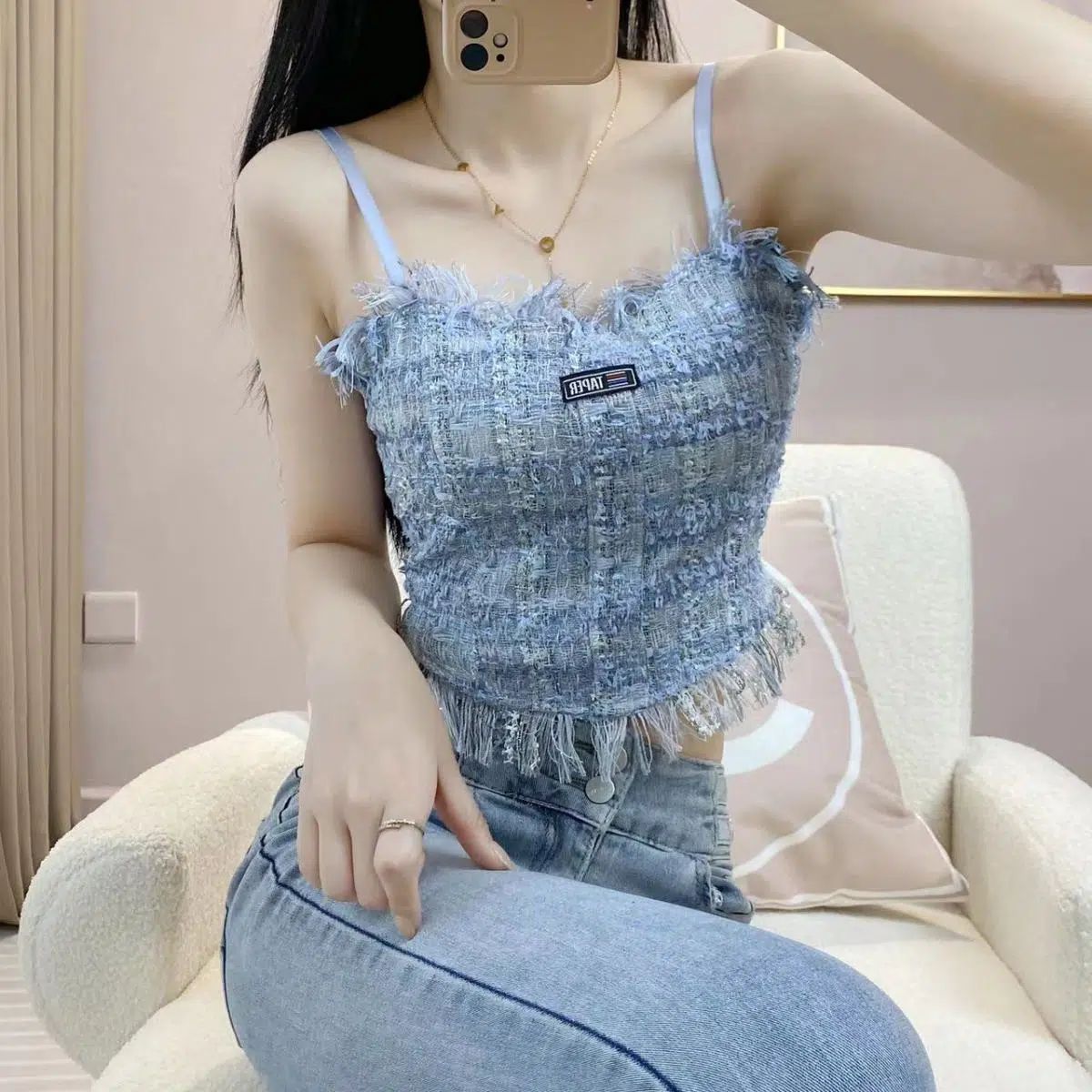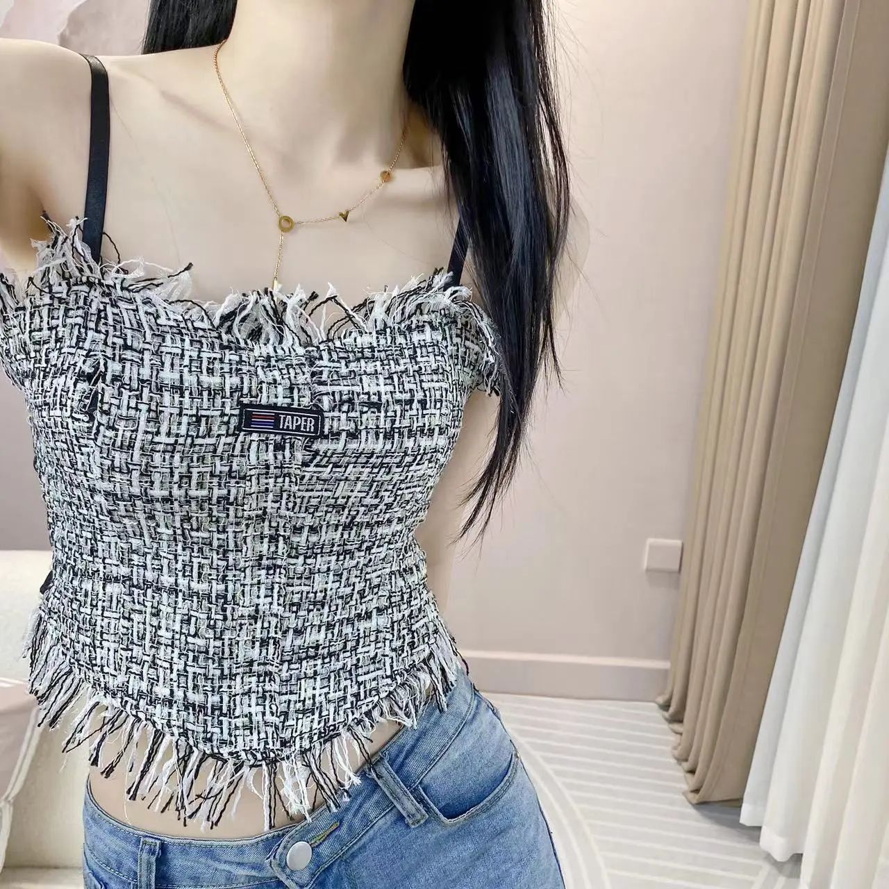 トレンドのツイード風素材にフリンジデザインがおしゃれなビスチェです。 胸パッド付きで美しいシルエットをキープ。 デニムとの相性も抜群で、カジュアルからきれいめまで幅広く活躍します。 上品な質感で大人女性にぴったりのアイテムです。