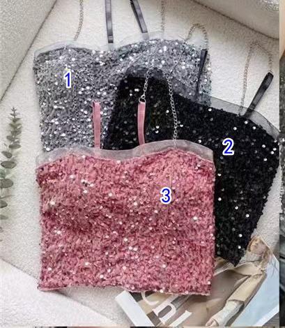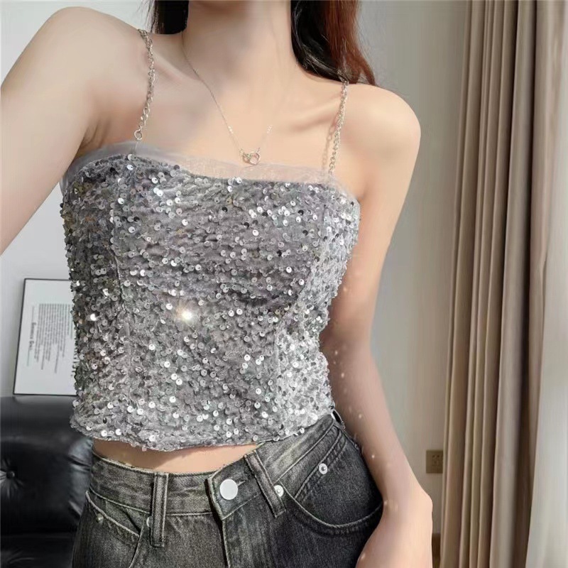 華やかなスパンコール装飾が美しいビスチェタイプのキャミソールです。 シアー素材との組み合わせで上品な透け感を演出。 パーティーや特別な日のおしゃれにぴったりな一枚です。