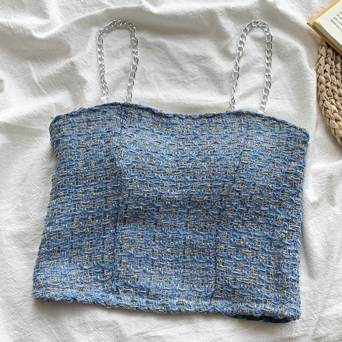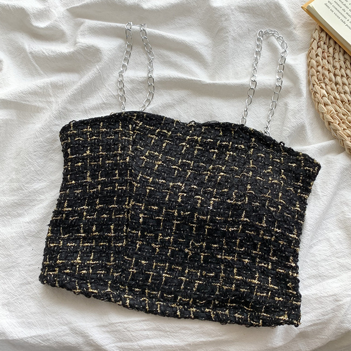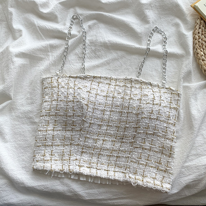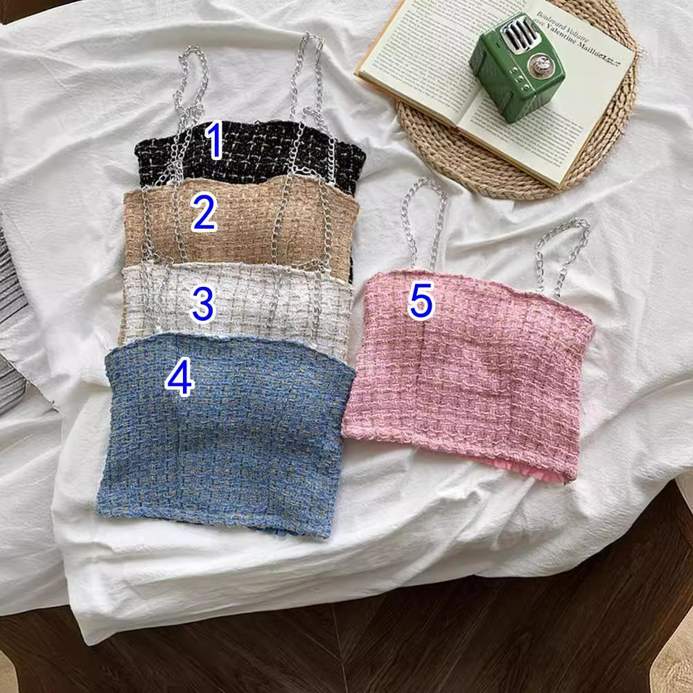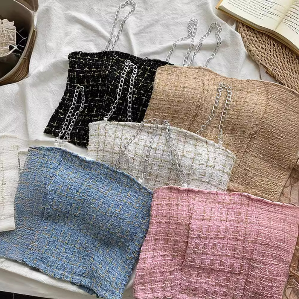 上品なツイード調素材を使用したビスチェです。 胸パッド付きで美しいシルエットを演出し、 チェーンストラップがアクセントになっています。 5色展開でお好みの色をお選びいただけます。