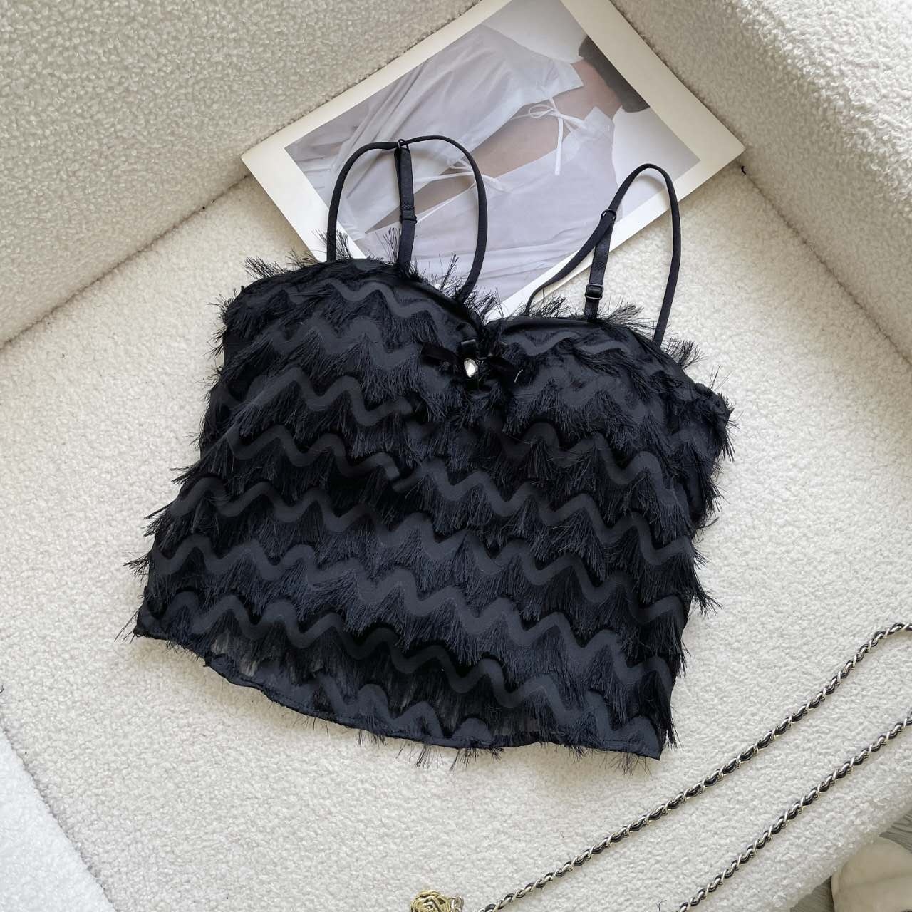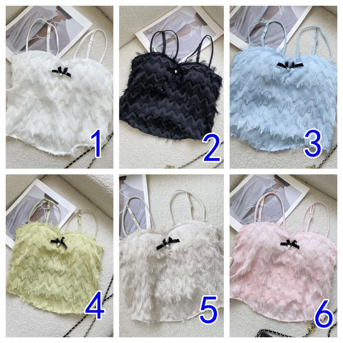 ふわふわフリンジが可愛いビスチェタイプのキャミソール風トップスです。 6色のカラーバリエーションで、どんなコーデにも合わせやすいデザイン。 胸元の小さなリボンがアクセントになった、大人可愛いスタイルを演出します。