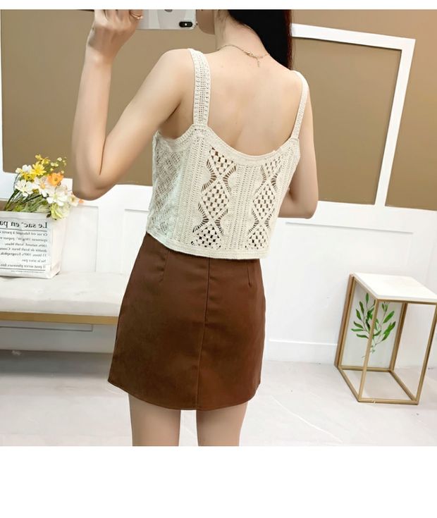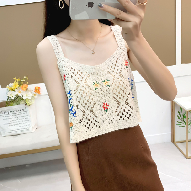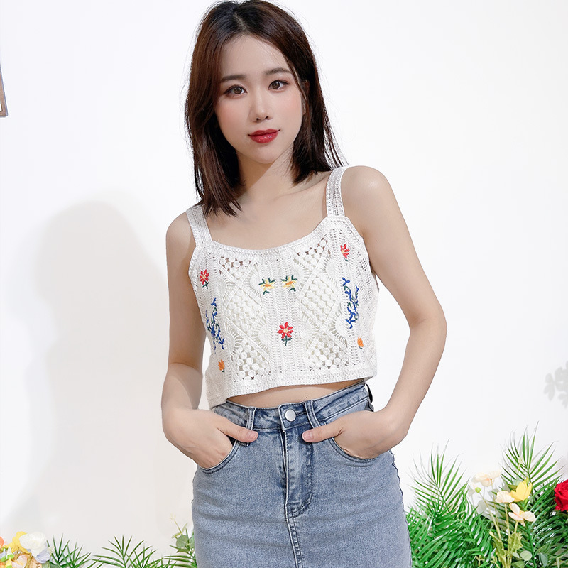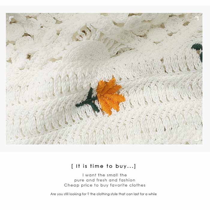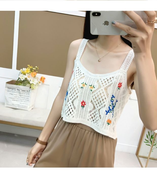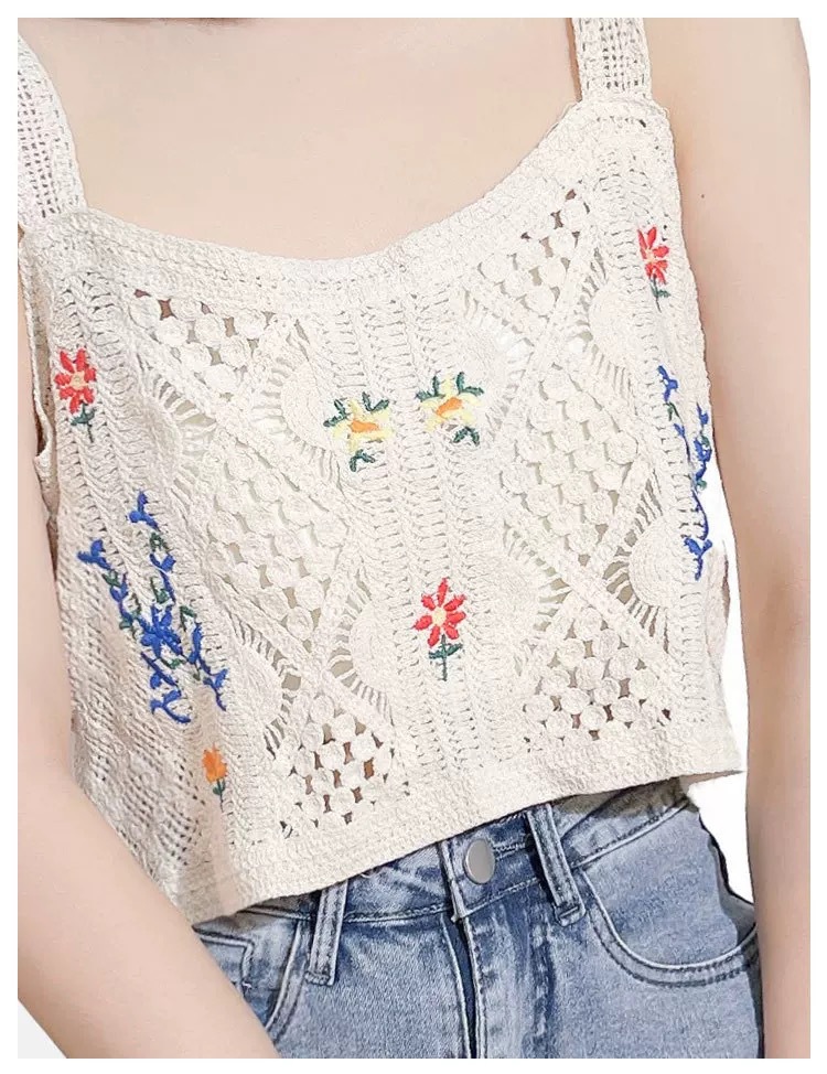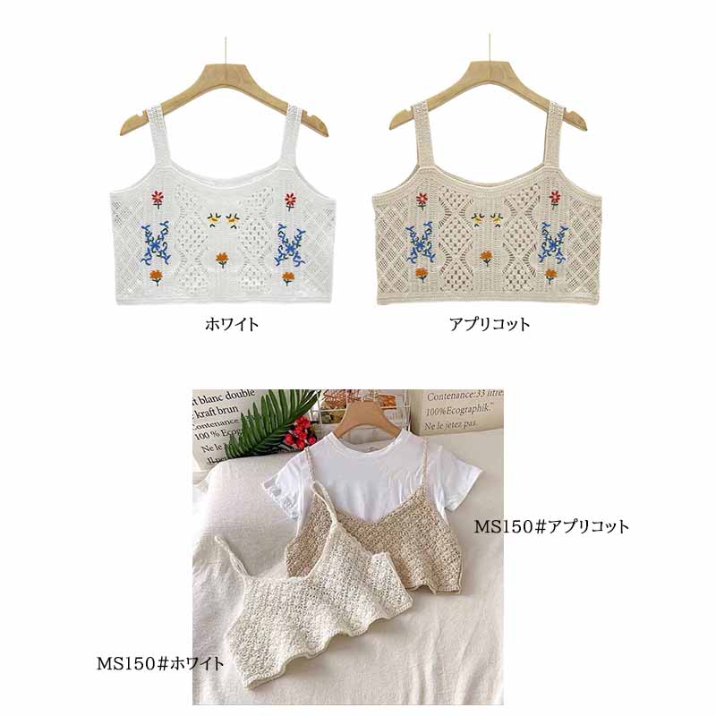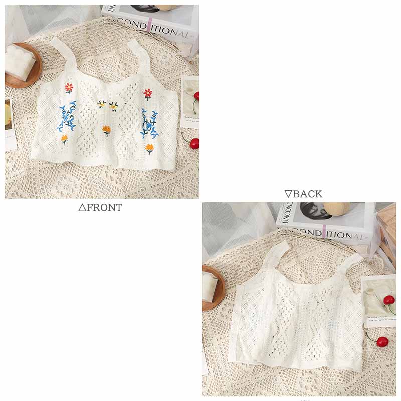 繊細なかぎ編みに可愛い花刺繍が映えるニットビスチェです。